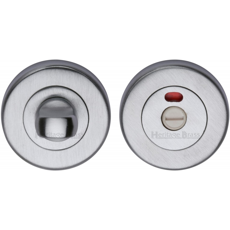 Solid brass bathroom turn and release with indicator from the Heritage Brass range by M. Marcus, finished in satin chrome. indicator that shows green or red to show whether vacant or engaged.